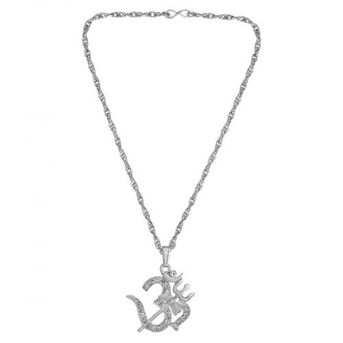 Silver Plated Brass Shiva Mahadev Bolenath Symbols Hald Moon, Damru, Om Pendant, with 24 Inch SILVER CHAIN.Elegant Shiv Symbols Mahadev Om Pendant design, with Exact OM proportions. Silver plated real Gold look, ideal to wear as dailyuse pendant, by all Genders and Age groups. All occasion wear. and a gift for any age or any gender. Made with Skin safe Brass alloy..The ultimate spiritual pendant, this pendant comprises of all four symbols associated with Lord Shiva. All the symbols too have the significance: 1. Moon Crescent: Wisdom is beyond the mind, but it needs to be expressed with a tinge of mind and this is symbolised by the crescent moon, which adorns the forehead of Lord Shiva. 2. Trishul Trident: Trishul sygnified that Shiva is above all three states of human soul: Waking, Dreaming and Sleeping, yet he upholds and controls all three states, It also symbolises the trinity of Brahma, Vishnu and Mahesh. It also symbolises Shivas control on Land, Sea and Sky. It is also a symbol of destruction for all the evils and bad omens for the mankind. 3. Damru Drum: It symbolises the Universe which is always expanding and collapsing, according to Hindu mythology. This itself is a process of creation. It also is symbol of sound, which itself is vibrant, and lift human good spirits. 4, Om: The most powerful, word and sound, in Hundu mythology, widely belioeved to be the first sound of this universe creation. It is a universal hindu symbol, one of the most reverred, and supposed to be the single most powerful chant in Hindu mythology. Thus this is a thoughtfully created meaningful pendant, which is made with 100% anti-allergy,skin safe metal. Pendant is studded with AAA quality Austrian Diamonds. 24 Inch long Ball chain comes with it. It can be worn by all genders, young and old. A very good gifting option, for all occassions and all age groups.
