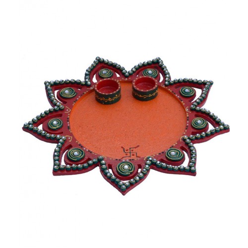 A gift that is bound to impress your women family members and friends. Offer prayers in style with this majestic Papier-Mache Decorative Pooja Thali. Embellished with Red, Orange and Green color it adds to the grace of your Pooja Room whereas a swastika sign makes it more auspicious. Complemented with roli-tikka container it will surely make celebrations memorable. Expert workmanship on this papier-mache pooja plate awards it a dazzling look. For its incredible appeal, it serves as an ideal gift for your loved ones, family and friends. This marble plate is diligently handcrafted by skilled artisans from the house of eCraftIndia using various traditional techniques.