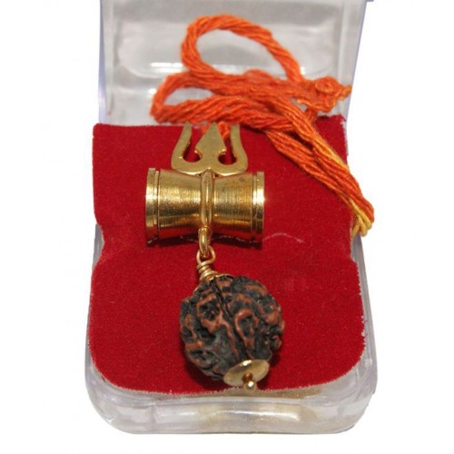 This charismatic Kavach holds three fold powers of Lord Shiva. It has a Trishul, a Damaroo and a Rudraksha (All favourite to Lord Shiva) Lord Shiva uses Trishul when HE gets angry, to destroy the evils from the earth. He plays Damaroo (a musical instrument) when He is happy which fills the surroundings with positive energy. Rudraksha is said to be an eye or tear of the lord, which signifies health and equilibrium of mind. This auspicious Kavach is made of combination of eight metals with a good amount of gold into it. Hence, it shall retain its shine and never tarnish.