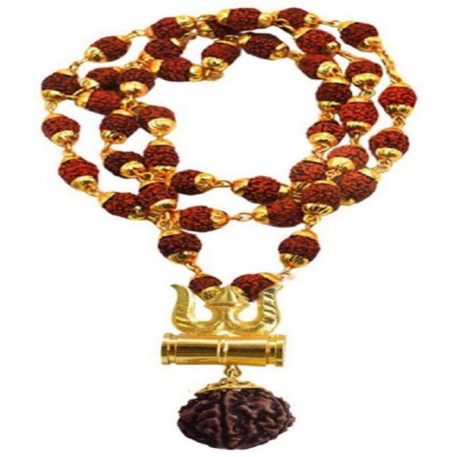 set of 1 Brown Wood and Brass Kavach Rudraksha Trishula Damru Locket Pendant Necklace for Men and Women