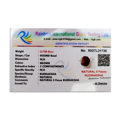 Stone Details : Stone : 5 Mukhi 5 Face Rudraksha Pendant Locket Shape : Round Weight : Total 2.720 Gram Size : 12 x 14 MM Color : Brown Origin : Nepal Quality : Very Good Cod : QCG 1784 .