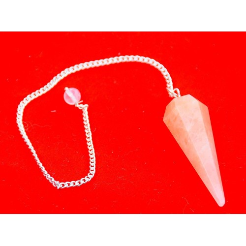 These Rose quartz Pendulums are faceted with 6 sides and have a faceted top. These crystal pendulums have a silver plated metal chain with Crystal quartz Bead on the end. Each of these Pendulums is unique, some longer and thinner, some shorter and fatter. To scry using a pendulum, you hold the small end in your hand, remaining very still, and ask a yes or no question. If the pendulum moves in a circle, the answer is yes, and if it moves from side to side, then the answer is no. This is a very basic explanation, but let your intuition guide you. When asking questions, try holding the Pendulum over your favorite stone or crystal for clearer answers. The soothing energy of Rose quartz fosters empathy, reconciliation, and forgiveness of others. Lowering stress and tension in the heart, Rose quartz clears out anger, jealousy, and resentment of others, and allows healing of heart issues and dis-ease associated with holding on to such negative emotions. Pendulums can be used to tap into the your subconscious, as they help you to access your inner guidance.