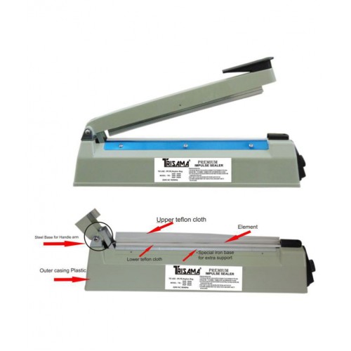 Machine overview - TRISAMA impulse sealing machine is a plastic body sealing machine. It is a user friendly sealing machine with outstanding reliability . . 2. Operation- the operation of the machine is very easy. Just put a plastic bag on the sealing platform , and then push down the handle . After 1-2 second ,release the handle .The perfect seal is complete. 3. Purpose - this sealing machine is perfect for sealing pe and pp bags, to pack various kinds of candy ,food stuff, general merchandises, stationary , bakery items etc. 4. Indicator light - the electronic circuit controls the heat time automatically, the light turns off to cut off the power automatically. 5 .Timer knob - this sealing machine includes the feature of timer knob. You can increase or decrease the heat time using timer knobe to avoid any break, damage or non tighten seal. 6. If your face any problem in operating the machine please contact our Customer Care Number 08965073636.