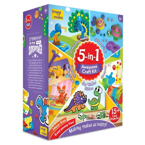 5-in-1 Awesome Craft Kit is a great art and craft set to explore the world of creativity which and has the best craft ideas for kids. From Model Making sets to 3D Paper Craft and Stamping and Colouring to Clay Activity- it has it all! This kit is a great way to introduce the child in the different craft forms from a very young age. It also helps in developing Creative Problem Solving Skills, Eye Hand Co-ordination and Motor Skills. The activities are packed in different sleek boxes which are easy to carry even while you are travelling. In 3D Miniatures Model, kids can create up to 4 Bird Models which are of EVA foam material. We provide 4 Creative Cards with Spyro Coiler (manual quilling tool) and 40 Sticky Back Strips for the kids to enjoy paper quilling. In Clay Window Stickers, we have Dotz clay (air dry clay) pouches which can be used to fill up the window stickers to decorate the room! Stamping is now much more fun with our Dual Tip Stamp Pens and 6 Stamps that are designed for easy blending. The 4 Creative Projects Template makes it more interesting and encourage the kids get started in stamping and then go on to create more and more. In 3D Paper Craft for kids - we include 3 Plastic Moulds and 30 Crinkle Sticky Back Strips to create 3D models of a Frog, a Fish and a Turtle - using strips of corrugated paper. Our products meet the highest standards of quality and safety. All the materials included in this kit are non toxic and safe for kids. Each of us loves to create! Our vivid imaginations provide an endless stream of awesome ideas. The contents of this box are a step in that direction. A great gifting option to encourage creativity in kids.