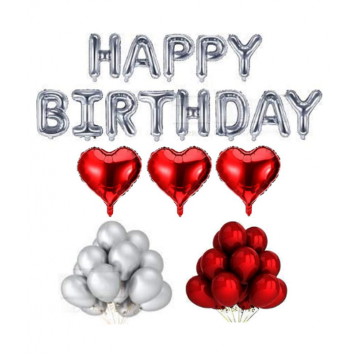 Blooms Present Special Combo Happy Happy letter foil balloon (Set of Silver) + 40pcs metallic balloons +8 heart shape Balloons * 13 pcs Happy Birthday Letter Foil Balloon Set of Silver + Pack of 8heart shape balloons + Silver , red Metallic Balloons * Ship Non inflated, Height of each letter is approx 16 inches and can cover wall space of about 20 sq. Feet * Perfect for Decorations - * What to Fill With: balloons can be filled with air, helium gas. Helium gas can make balloons float up.