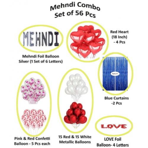 "Blooms Event Presents Combo in which you will get 1 Mehendi silver Foil Balloons, 1 Red LOVE Foil Balloons, 2 Pcs Blue Metallic Foil Curtains ,5 Pcs Pink and 5 Pcs Red Confetti Balloons, 10 Red and 10 White 10 pink Metallic Balloons, 4 Pieces Red HEART Foil Balloons.