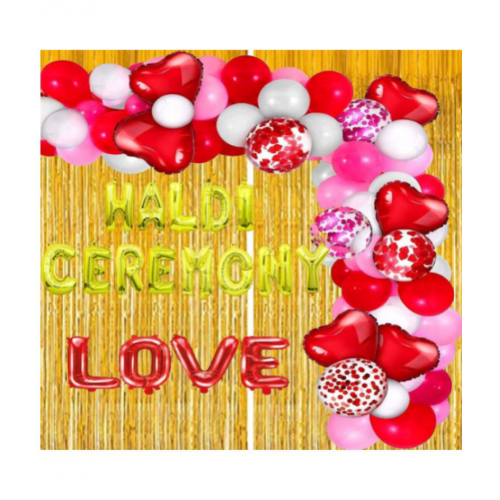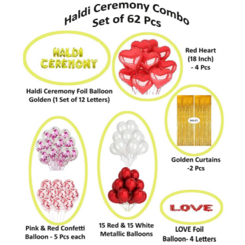 This super trendy decoration combo is specially designed for your loved ones and spread love, glitter, and happiness around you. These items are Non-toxic, eco-friendly and safe to be used around children." * 1 HALDI CEREMONY Golden Foil Balloons, 1 Red LOVE Foil Balloons, 2 Pcs Golden Metallic Foil Curtains ,5 Pcs Pink and 5 Pcs Red Confetti Balloons, 10 Red and 10 White 10 pink Metallic Balloons, 4 Pieces Red HEART Foil Balloons * 100 % high premium quality products *Easy to use and easy to carry * long lasting and kids friendly * Pocket saver and Attractive.