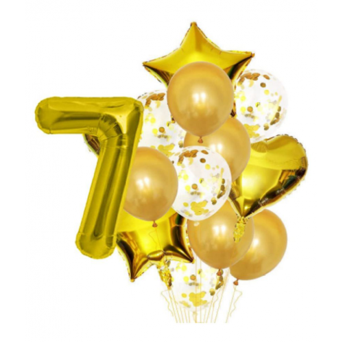 Blooms Event Presents Combo in which you will gets 2Golden Heart foil, 2 Golden Star Foil ,5 golden Confetti Balloon , 5 golden metallic Balloon , 7 Number golden balloon for Party Decorations MADE IN INDIA PRODUCT This super trendy decoration combo will create shine and glitter in your party . "*2Golden Heart foil, 2 Golden Star Foil ,5 golden Confetti Balloon , 5 golden metallic Balloon , 7 Number golden balloon .