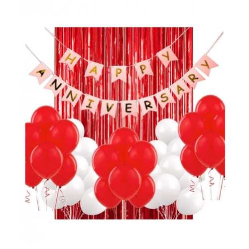 Blooms Event Happy Anniversary Red Banner, 1 Red fringe, 10 pcs Red, 10 pcs White Balloons Set of 22 Pcs
