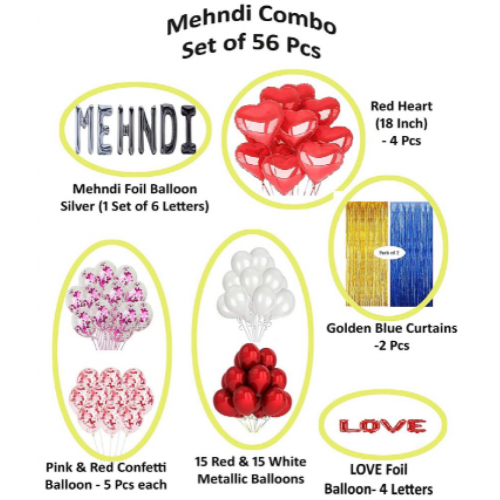 "Blooms Event Presents Combo in which you will get 1 Mehendi silver Foil Balloons, 1 Red LOVE Foil Balloons, 1 Pcs golden Metallic Foil Curtains1 Blue ,5 Pcs Pink and 5 Pcs Red Confetti Balloons, 10 Red and 10 White 10 pink Metallic Balloons, 4 Pieces Red HEART Foil Balloons.