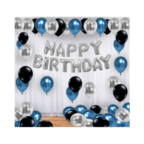 (3). This Pack of 58 includes 15 Blue, 15 Black & 15 Silver Metallic Balloons along with the set of silver 13 letter happy birthday foil.