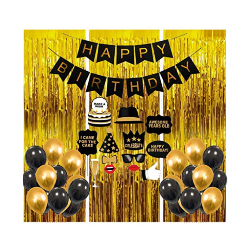 Blooms Present Interesting Birthday Combo This Combo has Happy Birthday Banner + 3Golden Fringe Curtain + 1Selfie props +60 Black,gold Metallic Balloon * 13 pcsHappy Birthday Banner + 3Golden Fringe Curtain + 1Selfie props +60 Black,gold Metallic Balloon * Ship Non inflated, Height of each letter is approx 16 inches and can cover wall space of about 20 sq. Feet * Perfect for Decorations - * What to Fill With: balloons can be filled with air, helium gas. Helium gas can make balloons float up.