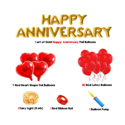 Blooms Prime Special Happy Anniversary Decoration Kit (Pack of 6 items) This All in one kit Have Amazing Heart Shape Foil Balloon, Happy Anniversary Letters Foil Balloon, Red Balloons, Red Ribbion, Balloon Pump and Special party Fairy Lights. HASSLE FREE ANNIVERSARY PARTY PLANNING: Find everything you need to plan a Anniversary party . Planned out with a logical order and a best fusion of Anniversary props and decor items, this is as hassle-free as it gets! Blooms Anniversary Kit easy to plan No more running around looking for Anniversary decor items or searching away to figure out how to keep a bunch of energetic kids engaged. * Blooms Prime Special Happy Anniversary Decoration Kit (Pack of 6 items) * Blooms Present Special Happy Anniversary Decoration Kit with Heart Shape Foil Balloon, Happy Anniversary Letters Foil Balloon, Red Balloons, Red Ribbion, Balloon Pump and Special party Fairy Lights. * • Best and trending Anniversary Decor in less * • HASSLE FREE ANNIVERSARY PARTY PLANNING: Find everything you need to plan a Anniversary party . Planned out with a logical order and a best fusion of Anniversary props and decor items, this is as hassle-free as it gets! * Blooms Anniversary Kit easy to plan No more running around looking for Anniversary decor items or searching away to figure out how to keep a bunch of energetic kids engaged.