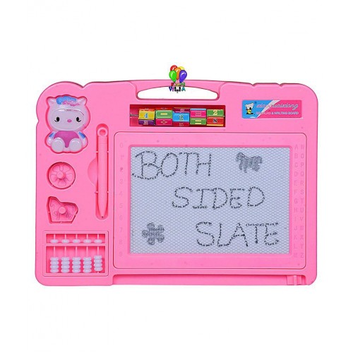 This Double Sided Magic Writing Board lets your child practice writing and drawing without using pencils or erasers. It has a Magnetic Board on one side and a Blackboard on the other. Write with the Stylus Pen on the White Magnetic Board and Chalks on the Blackboard. The sliding eraser wipes off the writing and let the kids practice again and again. The Magic Writing Board also includes 2 Stampers, Abacus Game for improving counting skills and a Calculation Panel for improving math skills. Kids can carry this board with ease by the handle.