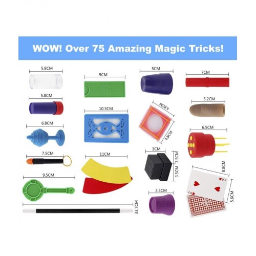 Perform 75+ Tricks– 75 Magic Tricks with Instructions, Includes: Magic Wand, The Disappearing Coin Cups and Balls Ball and Vase, Mind Reading Box, Money Tube, Two Card Monte, Penetrating Frame etc.