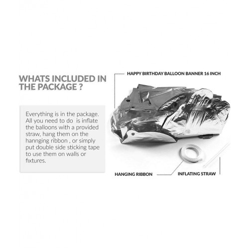 Package includes- 42 pc Premium Blue, Silver and Black Balloon, 1 pc Silver Happy Birthday Banner (13 Letter), 1 Glue Dot, 1 Air Pump