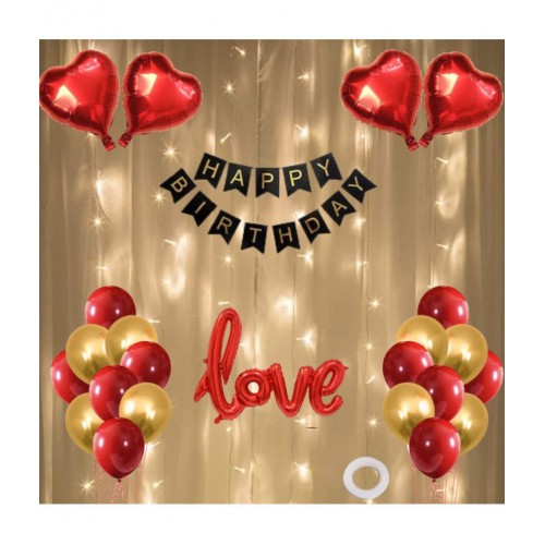 Happy Birthday Banner (Black) + 30 Metallic Balloon (Red,Gold) + Cursive Love Foil(Red) + 4 Dil(Red) + 1 Ribbon for happy birthday decoration item, birthday decoration kit, birthday balloon decoration combo for Boys, Girls, Kids, husband and Wife.
