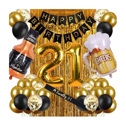 Happy Birthday Banner (Black) + 30 Metallic Balloon(Black,Gold) + 5 Confetti Balloon(Golden) + 2Fringe(Golden) + 21FoilNumber + 1Bottel(Black) + 1 Foil Mug Happy Birthday Decorations Kit Combo for Boys & Girls