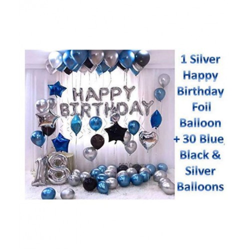 Pack of 13 LETTERS SILVER HAPPY BIRTHDAY FOIL BALLOONS WITH 30 METALLIC BLUE BLACK AND SILVER BALLOONS Self-sealing, reusable, includes straw letter balloon Package :happy birthday - 13 letters size:14 inch material : aluminium film