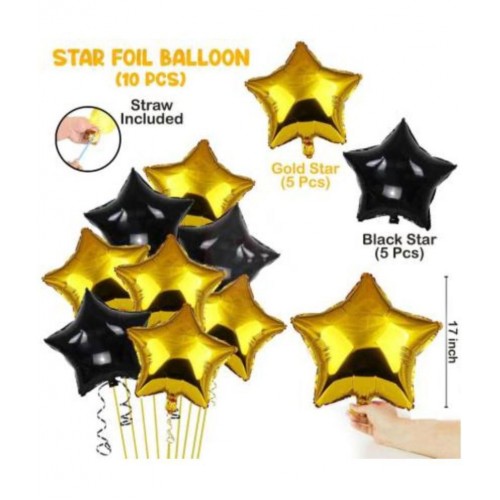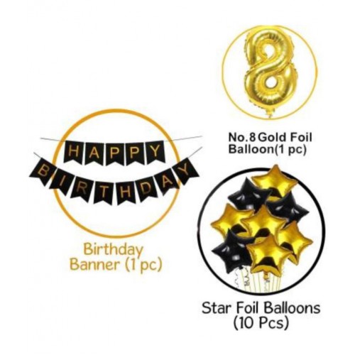 KR 8th Happy Birthday Balloons Decoration Kit Items Combo-12Pcs for Kids Boys, Girls, 10 Star Foil Balloons, 1 Banner ,1 number foil balloon Balloon (Black, Gold, Pack of 12)