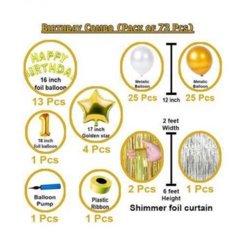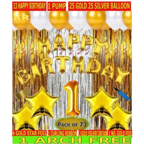 KR Solid Boy girl & kids First/1st happy birthday combo/kit material for party decorations (Set of 73) Happy birthday combo pack gives a complete beautiful touch to your party decorations. Pack includes (Happy birthday foil balloon letters, Shimmer foil curtain, Metallic balloons, Plastic ribbon for decoration, balloon pump, Star shape foil balloons, 1 number foil balloon). Balloon (Gold, Silver, Pack of 73)
