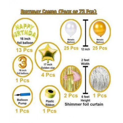 KR Solid Boy girl & kids Third/3rd happy birthday combo/kit material for party decorations (Set of 73) Happy birthday combo pack gives a complete beautiful touch to your party decorations. Pack includes (Happy birthday foil balloon letters, Shimmer foil curtain, Metalic balloons, Plastic ribbon for decoration, balloon pump, Star shape foil balloons, 1 number foil balloon). Balloon (Gold, Silver, Pack of 73)