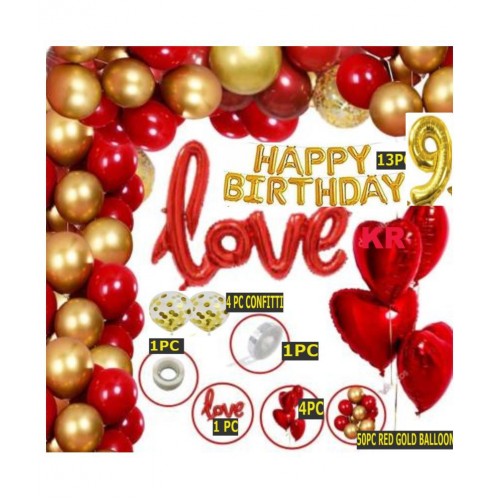 KR Solid Girls Boys 9th Happy Birthday Balloons Decoration Kit Combo (PACK OF 75) , Happy Birthday(13) Red Love Foil(1) , Heart Foil(4) ,Arch(1) , Glue Dot (1), 50 Pcs Metallic Balloons , Confetti Balloon (4). 9 No. Gold Foil Balloon for Girl Boys Kids Baby Ninth Birthday Decoration, (Decoration for Weddings, Engagement, Baby Shower, Birthday, Anniversary ) Party ( Red Gold Theme ,Pack of 75)