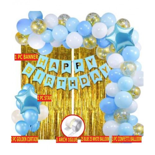 KR Solid Happy Birthday Decoration Kit Combo - 60pcs Birthday Banner Golden Foil Curtain Metallic Confetti Balloons With Glue Dot for Boys Adult Husband Grand Father Dad/Happy Birthday Decorations Items Set Balloon (Gold, Blue, White, Pack of 60)