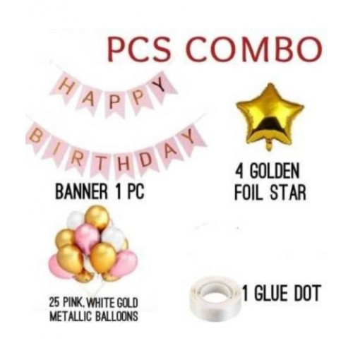 KR Solid Pink Happy Birthday Banner+4 pic gold star1 pic glue dot 25 Pcs Metallic Balloon for Kids Girls Boys Women Birthday, Baby Shower, Princess, 1st, 2nd Years Decorations Combo Kit Exclusive Packet Letter Balloon (Pink, Gold, White, Pack of 1) Balloon Balloon (Multicolor, Pack of 31)