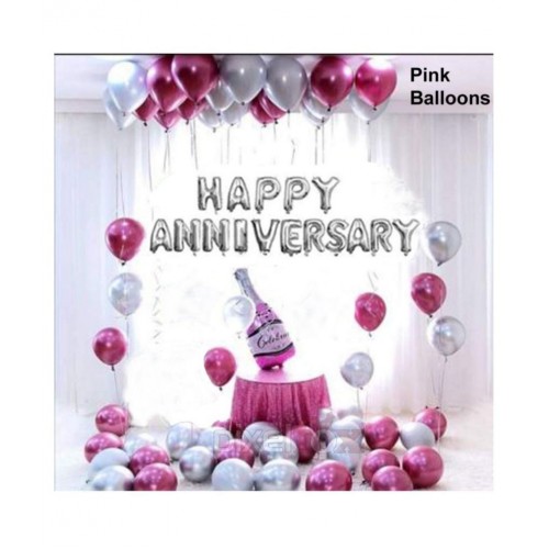 Kiran Enterprises Happy Anniversary (16 Silver Foil Letters) + 1 Pink Bottle + 30 Metallic Balloons Combo (Silver , Pink)