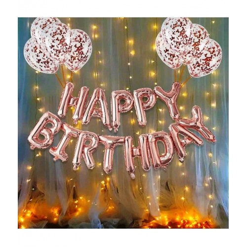 This exclusive birthday decorations item combo set of 10pcs includes: 1pcs Rose Gold happy birthday Foil banner, 6pcs Rose Gold confetti balloon With 6 Pcs Rose Gold HD Metallic Balloon and 1set led light 9 Meter long. This birthday decoration kit with string lights is very trending now and make one of the best birthday backdrop for your loved ones.
