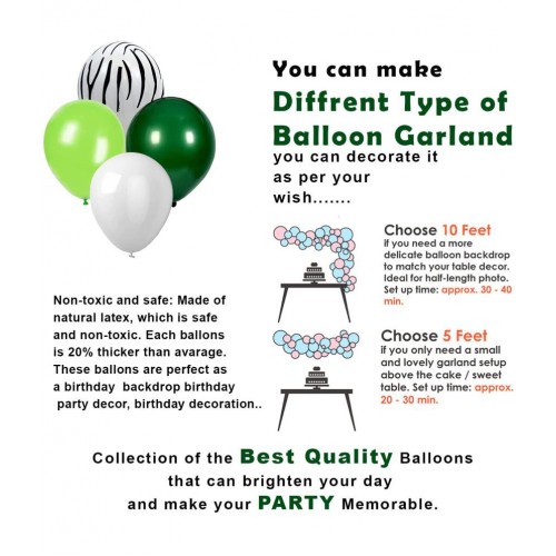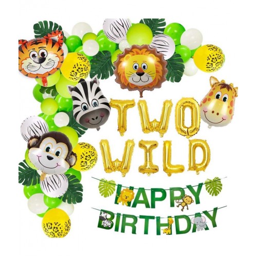 • A COMPLETE JUNGE THEME BIRTHDAY DECORATION PACK : This exclusive 55Pcs jungle theme happy birthday decoration set includes: 5inch 5pcs light green balloon, 5inch 5pcs dark green, 5inch 5pcs white, 12inch 10pcs light green, 12inch 10pcs dark green, 12inch 10pcs zebra print, 12inch 10pcs tiger print balloon, 5pcs zebra, monkey, tiger, ziraffe, lion foil balloon, 1pc happy birthday paper bunting and 1pc two wild foil balloons. • HOW TO USE | HOW TO REPACK FOR REUSE : Jungle theme happy birthday banner is made of thick cardstock paper and requires 5 minutes of assembling. Green colour fringe foil curtain is 3FT by 6FT in size each and has double tape behind to stick it on the wall as a birthday backdrop, animal foil balloons can blown with air or helium and can be inflated with hand pump or electric pump. PLEASE DONOT OVERFILL THE BALLOONS. With the help of glue dot and balloon arch and hanger u can easily set it up. • VALUE FOR MONEY: Our Jungle themed birthday decoration items combo includes all the products which is essential for setting up a beautiful backdrops, cake table and its a complete pack.It is very EAST TO SET UP and make the party lively. Use this jungle theme decor kit for your loved ones like boys or girls, friends son or daughter, newborn, toddlers. Which baby dont love animals ?? They are really crazy for animal balloons. • Special Favours Jungle Animals Party: Green and yellow with full vitality, for jungle theme party favors, take our party decor set for a gift to kids, boys or Girls, Him or Her. They will have an exciting and unforgettable jungle Dino Jurassic forest or Hawaiian birthday party.The family will have a lovely time together. Green Safari Party : Except for Jungle, farm or wild themed birthday party decoration, this jungle animal balloons kit can be used in all ceremonies such as baby shower, hawaii. • COMBINE WITH OTHER PARTY MATERIALS AND CLICK BEAUTIFUL IMAGES: This jungle theme happy birthday decoration kit for boys girls can be co