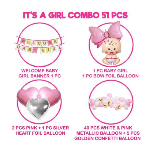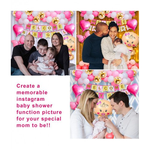 ● This exclusive set of baby shower balloons Package include 1pc welcome home baby girl banner, 1pc pink bow foil balloon, 40pcs pink white metallic, 5pcs golden confetti, 1pc baby girl foil foil, 2pcs pink heart foil and 1pc silver heartl foil balloon. This baby shower baloon set has been curated after a high demand from our "Party Propz" customers. ● These exclusive combo can be decorated in many ways. These baby shower decoration combo can be used for gender reveal party, gender neutral baby shower, elephant theme baby shower, jungle theme babyshowers, pink or blue babby shower, marathi baby shower, maternity shoot, welcome baby boy or girls, ready to pop, woodland, brewing baby shower decoretion.This set makes a beautiful gift to the mommy to be also. Everyone in the family loves this decoration. ● The baby girl and feet foil balloon and metallic balloons can be filled with helium, gas or air and can only float if filled with helium gas. This set can be combined with our other items like patel pink and blue fringe foil curtain, baby shower cake topper, mom to be sash/ sash/ dad to be badge, baby shower photo booth props, prematernity photoshoot, greenery backdrop, flower jwelleries, pregnant dresses, baby-shower favors, babies thank you card any photography props items " ● Our exclusive baby shower set is loved by the mom to be and hence can be used as a favour or gift to any mommy to be. Everyone will love this decor and it can make your party a hit.It is definately party propz one of the best created gender reveal, pink,blue or gold babyshower decorative. ● Create a memorable instagram baby shower function picture for your special mom to be!! Oh!! don't forget to tag us in facebook or instagram #Partypropz... You will surely love this decoration !!