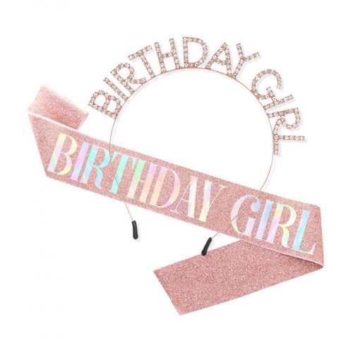 1 x rhinestone birthday girl head band; 1 x rosegold birthday sash |