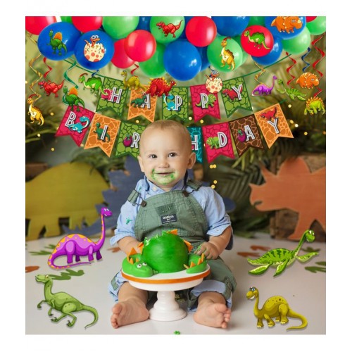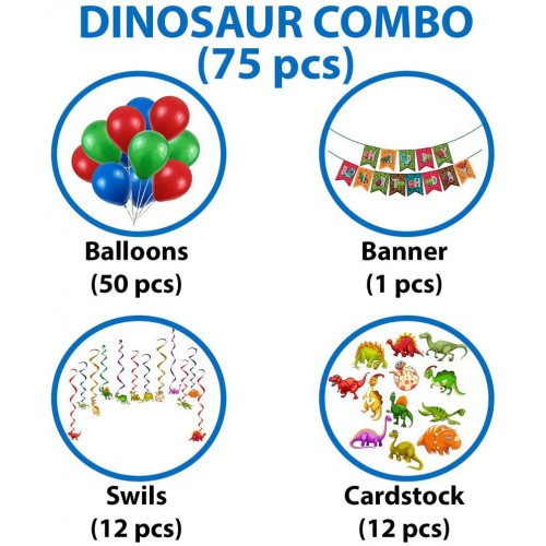 COMPLETE DINOSAUR THEME BIRTHDAY DECORATIONS : dinosaur birthday party decorations pack contains 1pc dino theme paper banner, 50pcs red blue green balloon, 12pcs swirls and 12pcs cardstock. EASY TO DECORATE | VALUE FOR MONEY: You only need to inflate all balloons with air pump. Use the glue points inside the set to stick the balloon and balloon arch to make arch where you want it, very easy to finish decoration within an hour.This set can be combine with our "Party Propz" different dinosaur products like: helium ballon, foil balloons, confetti baloons, swirls hanging decor, candles, cake set, costume, dino soft toys, hats, dinosau games, , stickers, photo booth props set etc. EXCELLENT CHOICE - Most of kids - girls or boys like dinosaurs party, jurassic styles party. A complete dinosaur party set with banner, balloons with leaves tattoo, cake toppers can satisfy the entire party event at one time and the children can have an exciting and memorable jungle dinosaur birthday party.Boys or girls and any age kid just love this set and the dino balloon included in this packet. This set materials is perfect to setup a great backdrop for your baby, toddler or kid bday party. BEAUTIFUL DECOR: Our 1st picture of the combo set describes exactly the same of how our product will look like. It looks same and your guests or any family member will totally love them. This dinosaur set will surely be one of the best decoration for your jungle or dinosaur lover kid. Kids can just put tatoos and get some nice pictures clicked which you can definately relish throughout your life time. USE IN MANY THEME DECORATION AND FOR ANY AGE DECOR : Dinosaur birthday decoration pack can be use for many years decoration from newborn, half birthday decorations for boys girls, 1st birthday decoration for boys, 2nd birthday decoration items for boys, 3rd birthday decoration items for boys, 4th birthday decoration items for boy, 5th birthday decoration items for boys, dinosaur balloons for birthday,