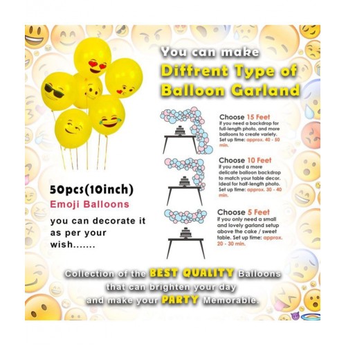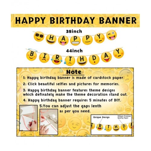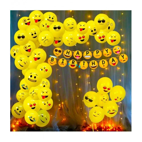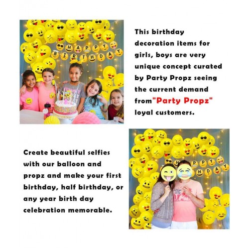 Emoji printed birthday Balloon and Banner packets inlcudes: 1pc emoji banner, 50pcs emoji theme balloon and 1pc led light set. These Emoji theme balloon and paper banner is perfect for any kids Birthday decoration, girl or boy and any age birthday like 1st, 2nd, 3rd, 4th, 5th, 6th, 7th,8th,9th etc or for any family member or friends who loves to be happy.BANNER IS MADE OF PAPER, BALLOON WITH RUBBERThis emoji printed baloon can be filled with helium gas or air and can be floated ONLY if filled with helium gas. Heart eyes, smirk, sunglasses, grimace, crying laughing various character over there.Yellow colour banner can be just hung as a backdrop and make the birthday decoration stand out. Create beautiful selfies with our balloon and propz and make your first birthday, half birthday, or any year birth day celebration memorable.The led string banner can be used with our other premium products like confetti balloon, smile bday foil balloon,thank you cards,smiley cake topper, games, foil curtain, black and golden metallic latex baloons, alphabet/ letters / word balloons, cupcake decorations,balloon glue dots, stand, personlized banners,rose gold decoration, photo booth props, birthday sash, balloon garland arch strip roll.This birthday decoration items for girls, boys are very unique concept curated by Party Propz seeing the current demand from our "Party Propz" loyal customers. This baloons banner and light set can be used for any Birthday theme like baby birthday decoration, princess theme, cake smash, theme, pink and gold birrhday supplies, rosie, blush theme, half birthday, 2nd birthday, 30th birthday, teenager, 16th birthday, 18th, quarantine, lockdown, birthday celebrations, snow etc.Create a beautiful birthday decoration photo of your loved ones and post it in instagram!!! OH!! don't forget to tag #party propz with your exclusive pictures. Our team will surely get a boo and we will work harder for more new and exclusive product for your