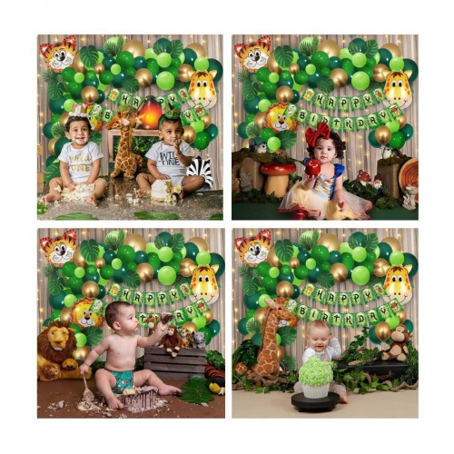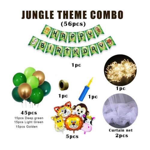 • A COMPLETE JUNGE THEME BIRTHDAY DECORATION PACK : This exclusive 57Pcs jungle theme happy birthday decoration set includes: 1pc jungle theme happy birthday banner, 6pcs animal foil balloon, 2pc white net curtain , 45Pcs metallic balloons, 1pc hand balloon pump, 1pc ribbon and 1pc fairy light. • HOW TO USE | HOW TO REPACK FOR REUSE : Jungle theme happy birthday banner is made of thick cardstock paper and requires 5 minutes of assembling. Green colour fringe foil curtain is 3FT by 6FT in size each and has double tape behind to stick it on the wall as a birthday backdrop, animal foil balloons can blown with air or helium and can be inflated with hand pump or electric pump. PLEASE DONOT OVERFILL THE BALLOONS. With the help of glue dot and balloon arch and hanger u can easily set it up.• VALUE FOR MONEY: Our Jungle themed birthday decoration items combo includes all the products which is essential for setting up a beautiful backdrops, cake table and its a complete pack.It is very EAST TO SET UP and make the party lively. Use this jungle theme decor kit for your loved ones like boys or girls, friends son or daughter, newborn, toddlers. Which baby dont love animals ?? They are really crazy for animal balloons.• Special Favours Jungle Animals Party: Green and yellow with full vitality, for jungle theme party favors, take our party decor set for a gift to kids, boys or Girls, Him or Her. The family will have a lovely time together. Green Safari Party : Except for Jungle, farm or wild themed birthday party decoration, this jungle animal balloons kit can be used in all ceremonies such as baby shower, hawaii.• COMBINE WITH OTHER PARTY MATERIALS AND CLICK BEAUTIFUL IMAGES: This jungle theme happy birthday decoration kit for boys girls can be combine with different party supplies like jungle theme photobooth props, animal , lion king soft toys, cake topper, candles, swirls hanging or anything. Use it for any themes decorations like hawaiian, birthday theme decoration for bo