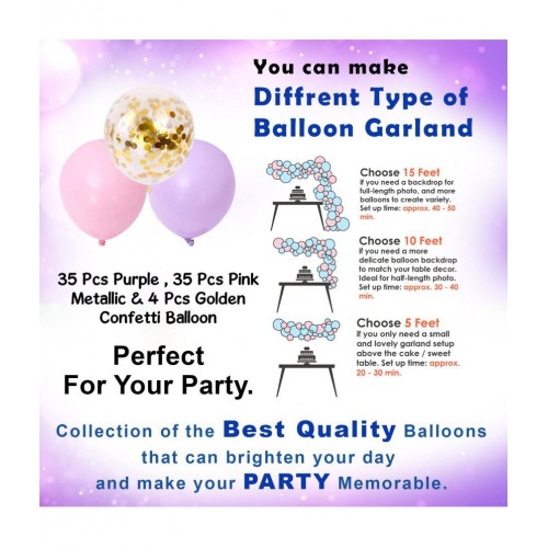 EXCLUSIVE PURPLE BIRTHDAY DECORATION KIT INCLUDES : INCLUDED 1pc happy birthday foil banner, 1pc golden pennant banner, 35pcs purple balloon, 35pcs pink balloon, 4pcs golden confetti, 2pcs white curtain, 1pc glue dot and 1pc arch. This purple elegant birthday balloon, banner and curtain combo decorative set can be combine with our "Party Propz" other decore propz like hairband, pink caps, tiara, birthday dress, card, birth day candles, bday topper, dresses, princess crown, pink and golden glitter sash, balloon accessories, months banner, pink or rose gold photo booth props set etc. This purple birthday balloon set helps in creating a perfect birthday celebration of your little child or teenager.Beautiful and elegant purple birthday decoration item kit propz is perfect to use in any home decor as a background, from ceiling or as a photobooth backdrop.It will definatley help us create memories which last longer. Give this pink birthday balloon decoration kit as a gift to your girlfriend, wife, teenager, girl or any women. They will surely love this decoration items.