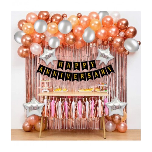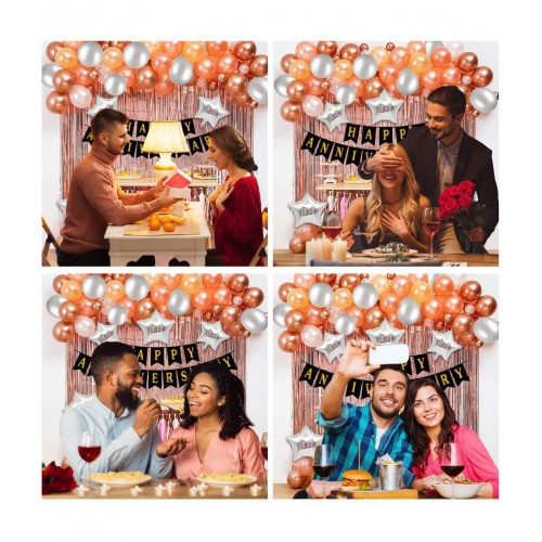 ANNIVERSARY DECORATION ITEMS COMBO : Rose gold happy anniversary decoration kit packet include 1pc Black happy anniversary banner , 12Pcs rose gold Metallic Balloons, 12Pcs silver metallic balloons, 4Pcs silver star foil balloons, 1Pc rose gold foil curtains and 1pc ribbon kit for anniversary decorations at home or bedroom. CREATE ROMANTIC ATMOSPHERE AT HOME & GIVE SURPRISE : It creates a mesmerising environment for the couple.This decor set can be a gift to bhaiya bhabi, brother, husband,wife, daughter in , son in , mom dad or any star couple. You can surprise the special loved ones with our unique fancy anniversary set.Put up great photos of the couple or your husband or wife,put the happy anniversary banner, put foil curtain as a backdrop, foil balloon and you are set to celebrate the anniversray.COMBINE WITH OTHER PARTY ITEMS SET : This happy anniversary banner can be combine with other party items like happy anniversary golden foil balloons, red, black, golden, silver metallic or latex balloon, heart shape foil baloon, golden red star foil balloon, fringe foil curtains, led string lights, photo light hanging, happy anniversary cake toppers, surprise explosion box, candles, anniversary balloon bouquet, happy anniversary card, cup cake topper, ised anniversary photo booth props.USE IN ANY ANNIVERSARY THEME PARTY OR YEAR CELEBRATION : This black and golden happy anniversary banner can be use for any year anniversary decoration like 1st , 2nd, 3rd, 10th, 11th, 15th, 20th, 25th, 30th, 40th, 50th, 60th anniversary or any colour theme anniversary parties like red and black, silver jubilee celebration, golden colour fifty anniversary party.