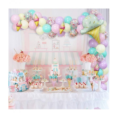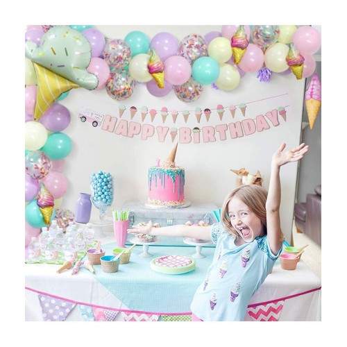 HAPPY BIRTHDAY BALLOONS SET | PACKAGE INCLUDES - 12pcs green 10-inch balloons, 12pcs yellow 10-inch balloons, 12pcs pink 10-inch balloons, 12pcs purple 10-inch balloons, 6pcs multicolor 10-inch confetti balloons, 1pc 35-inch ice-cream foil balloon, 4pcs 15-inch ice-cream foil balloon, 1pc balloon arch roll, 1pc glue dot roll, 2pc balloon arch hanger, 1pc tying knot. COMBINE WITH OTHER PARTY SUPPLIES: This exclusive and premium multicolor icecream theme balloon garland kit can be combine with other party items like happy birthday banner, alphabet foil balloons, boys birthday fairy string light, confetti balloon, balloon stand, candles, balloon pump machine, balloon curling ribbon roll. CAPTURE BEAUTIFUL MEMORIES : Want to capture a fabulous party Instagram picture for your loveable Son?? buy this... click and post !!! You are just one step away. This balloon garlnd kit can be decorated as a backdrop anywhere on wall, ceiling etc and definately will look beautiful.