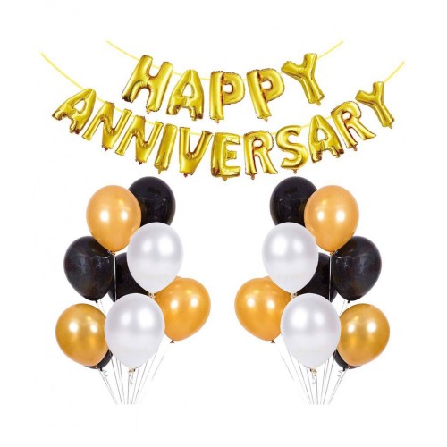 Happy Anniversary (16 Gold Foil Letters) + 30 Metallic Balloons Combo (Black , Gold , Silver) |
