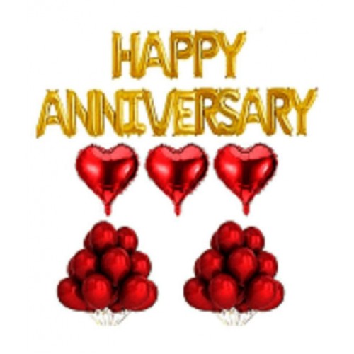 Pixelfox Happy Anniversary Foil Letters Balloons (Golden) + 3 Red Heart Foil Balloons + 30 Red Colour Balloons |