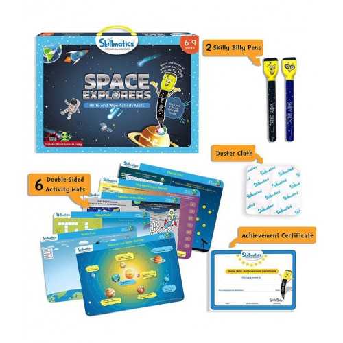 6 double-sided activity mats, 2 Skilly Billy pens, 1 duster cloth, 1 Welcome Letter and 1 Skilly Billy Achievement Certificate |