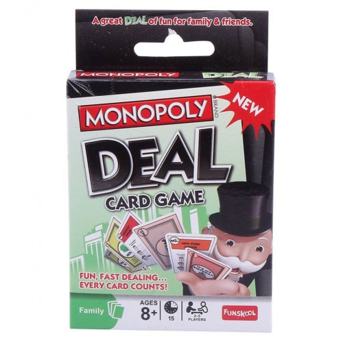 "One of the most important aspects of kid's psychology is that they wish to remain close to their parents and bond and board games and its different forms provide that opportunity for them. Toys, playthings and board games are all important parts of kids growing up and nothing gives them more pleasure than a round of fun board games with friends and family. It helps kids to develop their social skills and sharpens their retention capabilities and memory. Now, you can indulge with your kid in a fun round of the classic Monopoly board game with Funskool Monopoly Deal Card Game. Monopoly has been one of the most classic and popular board games among kids and adults alike. And this board game set from Funskool brings back the old charm of the classic game. Funskool Monopoly Deal Card Game will keep you and your kid engaged for hours. This Monopoly set contains 110 deal cards, 2 Mr. Monopoly cards and one instruction booklet. This Monopoly card game is an exciting set for the entire family as the participants have to collect three complete property sets but have to beware of the debt collectors, deal breakers and forced deals. You and your kid will have a fun time bonding over the numerous topsy-turvy situations that will come in every turn of the game. So, don't miss this opportunity to indulge in an exciting and fun-filled round of Monopoly with your kid as now you can purchase the Funskool Monopoly Deal Card Game online. "