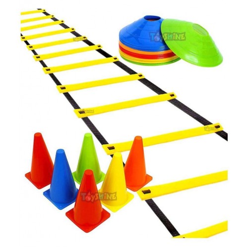 PRACTICE WELL: Many sports require a lot of practice and training, and that is where these vibrant colored training cones come into the picture. Vivid and round cones come packed together for a portable and effective pack of sports training equipment. An essential training tool and coaching equipment for a variety of sports training drills.\nMULTI-PURPOSE: Sports equipment for men and women, these sports accessories are great for both outdoor sports and indoor sports. Cones are stackable for easy carrying from place to place. Can be used for side-line, boundary markers, speed agility drills, obstacles, targets, and many other training activities.\nDURABLE: These sports cones are made of durable plastic, easy to see thanks to the bright color. These make excellent soccer cones for use as a running course or a soccer goal post, agility cones, activity cones, football equipment, basketball gear and overall great sports equipment and sports accessories for anyone.\nAGILITY LADDER: Ideal for athletic training, football, soccer, basketball drills, hockey, lacrosse, tennis, badminton, rugby to increase acceleration, leg strength, and speed, core skills, balance, rhythm, and body control.\nROUND SPORTS CONES: Excellent soccer cones for use as a racing field or soccer goal post, agility cones, activity cones, soccer gear, basketball gear and overall great sports gear and sports accessories for any person.
