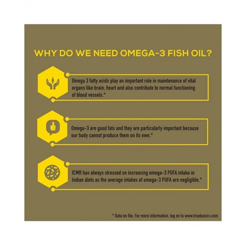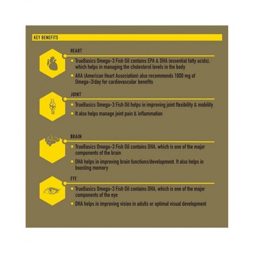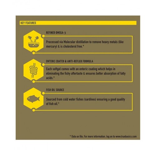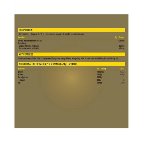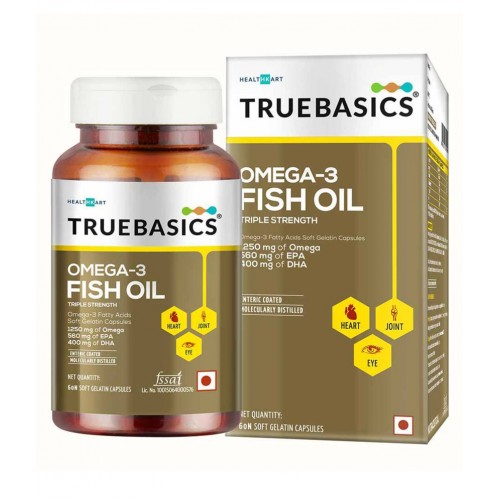 TrueBasics Omega-3 Fish Oil (from the house of HealthKart) is a rich source of Omega-3 fatty acids containing 1250mg of Omega-3 fatty acids. It is enriched with 560mg of EPA & 400mg of DHA and is beneficial in heart, joint, eye & brain health