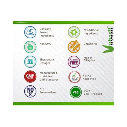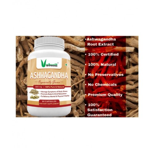Each vegetarian 800 mg capsule of ashwagandha contains ashwagandha root extract (withania somnifera) clear from sugar, artificial flavor, artificial color, preservatives. Botanical name of this plant is withania somnifera. It belongs to family solanaceae. Other names being winter cherry and Indian ginseng. Ashwagandha in Sanskrit means horse's smell, probably originating from the odor of its root which resembles a sweaty horse. Supports a healthy immune system. VUBASIL Ashwagandha is a 100% Pure, Natural, Herbal and Organic . It stimulates secretion of thyroid hormones, benefits diabetics, relieves anxiety and depression, strengthens heart muscles, boosts immunity, treats seizures and aids in improving vitality and fertility.