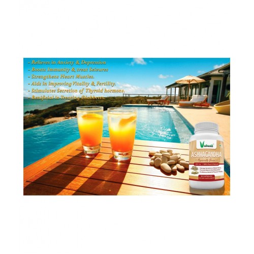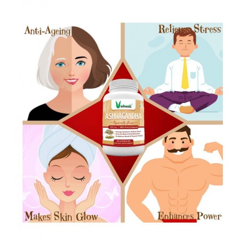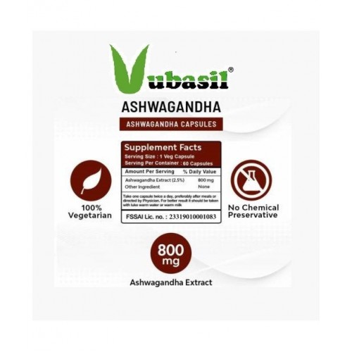 Each vegetarian 800 mg capsule of ashwagandha contains ashwagandha root extract (withania somnifera) clear from sugar, artificial flavor, artificial color, preservatives. Botanical name of this plant is withania somnifera. It belongs to family solanaceae. Other names being winter cherry and Indian ginseng. Ashwagandha in Sanskrit means horse's smell, probably originating from the odor of its root which resembles a sweaty horse. Supports a healthy immune system. VUBASIL Ashwagandha is a 100% Pure, Natural, Herbal and Organic Medicine. It stimulates secretion of thyroid hormones, benefits diabetics, relieves anxiety and depression, strengthens heart muscles, boosts immunity, treats seizures and aids in improving vitality and fertility.
