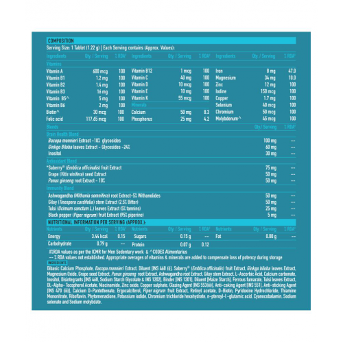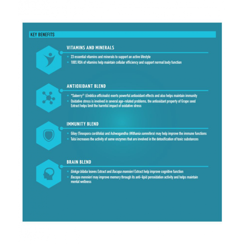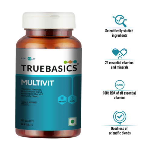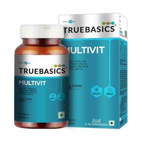 Adequate intake of vitamins and minerals supplements are required for nearly all metabolic processes, developmental, and growth processes, and for good health across the lifespan. However, a hectic lifestyle and wrong dietary habits affect the nutrients level in the body and their deficiency may lead to serious health issues. It is sometimes not possible for people to choose foods containing the recommended amounts of all essential micronutrients. In such a case, multivitamin tablets help in filling this critical nutritional gaps. TrueBasics® Multivitamin General for men and women provides 100% RDA of all essential Vitamins & Minerals that support an active lifestyle by improving cellular energy metabolism. In addition, scientific blends of TrueBasics® Multi vitamin General provide protection from the damaging effect of free radicals which are determinant of age-related disease, also improves immunity and brain function, and delays cognitive decline.