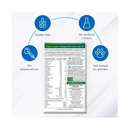 Specifically formulated to help safeguard the nutritional needs of men aged 70 and above. Nutrients to help support general wellbeing as well as key areas of age-related health including vision and immune health and cognitive function.